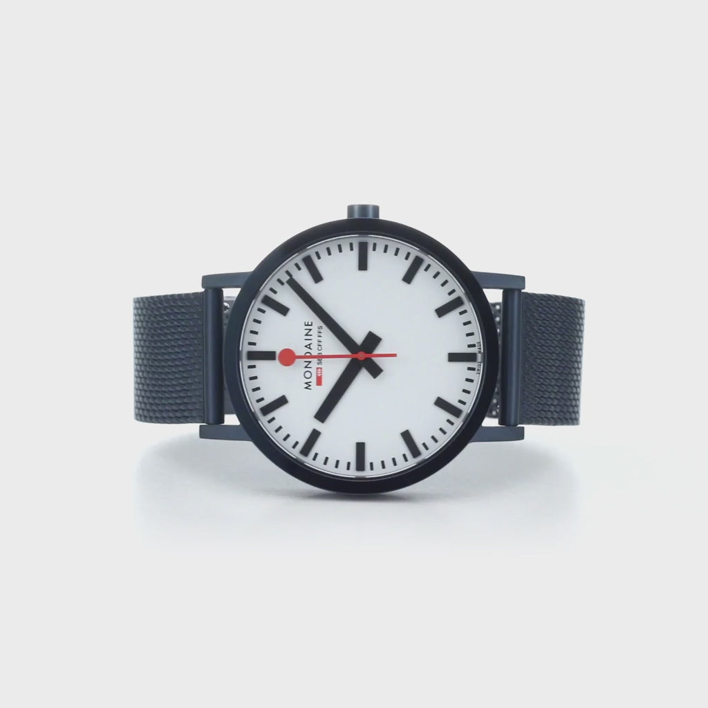 This 40mm timepiece pairs the iconic Swiss Railways design with an IP blue stainless steel mesh strap, creating a strong contrast against the crisp white dial. Signature black hour and minute markers and the famous red seconds hand ensure high legibility and unmistakable character. The watch features BackLight, a patented Mondaine technology, enabling the time to be read even in the dark. Crafted with a brushed stainless steel case and polished top ring, this Swiss Made watch combines minimalist elegance with durability. The quick-release strap system makes it easy to change the strap at any time.