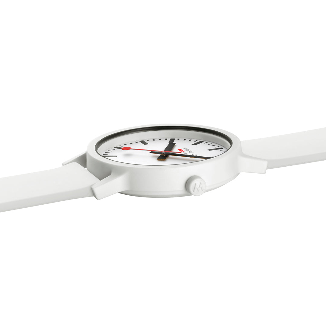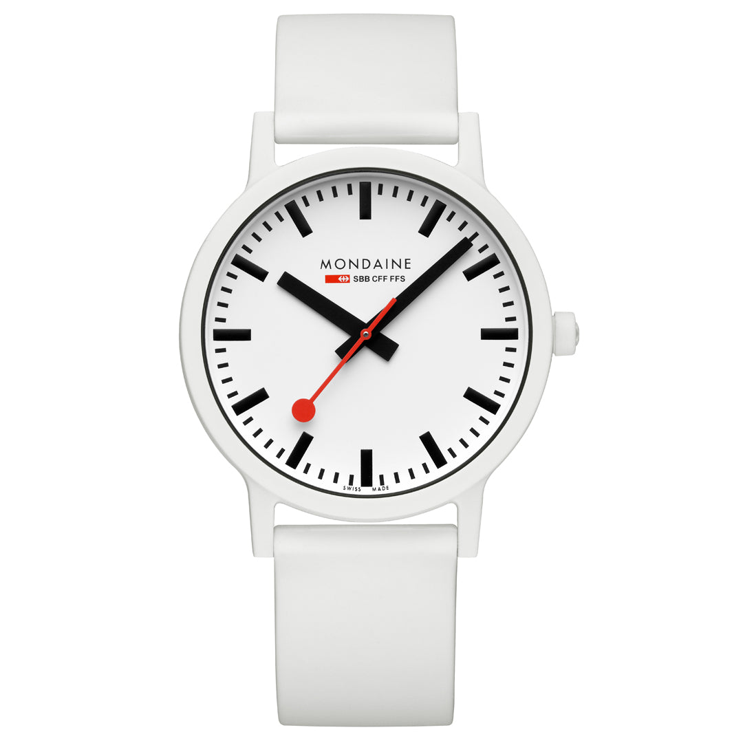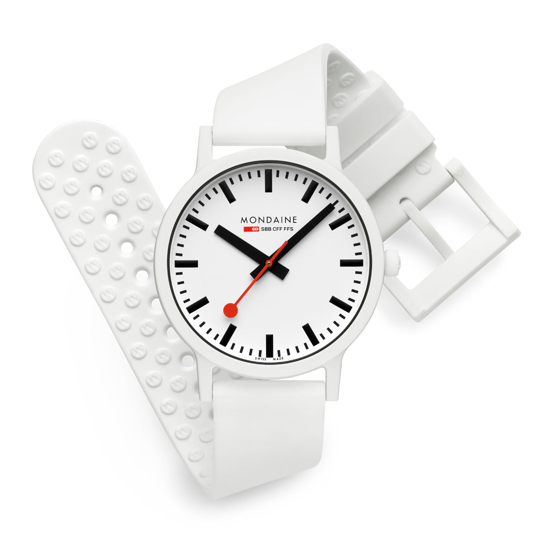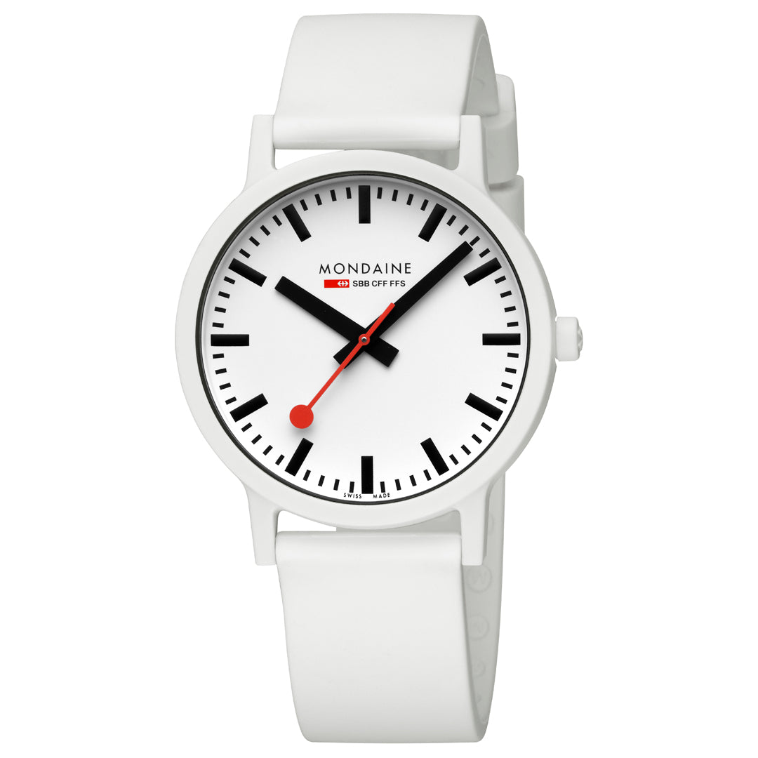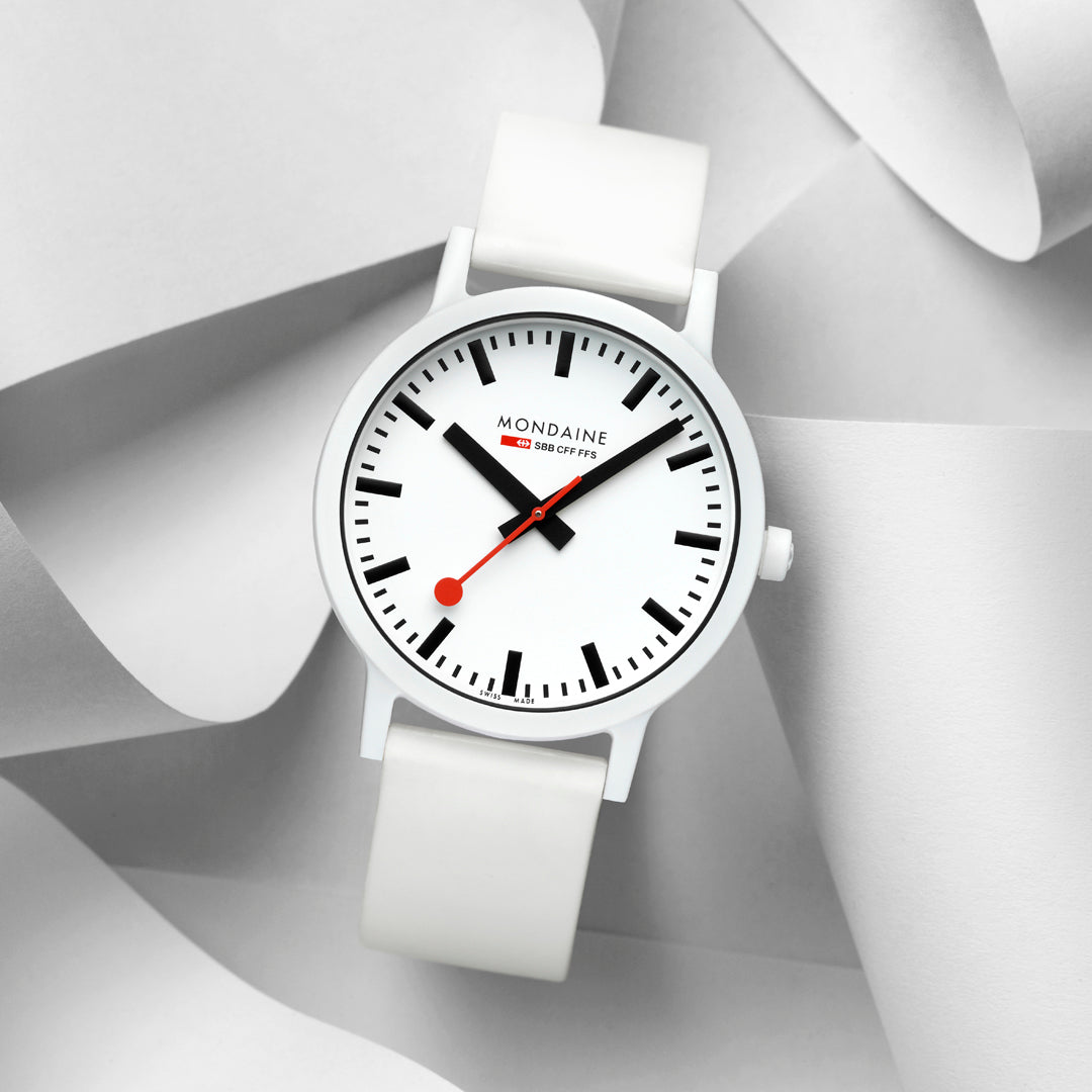 Bold. Minimal. Sustainable. This 41 mm essence watch brings a modern edge to iconic Swiss design with its crisp white dial and contrasting black inner ring. Made with a lightweight, durable case from renewable castor oil, this timepiece is as comfortable as it is conscious. Featuring the signature red seconds hand, Swiss Made quartz movement, and a quick-release strap system, it’s a perfect blend of form, function, and sustainability. A true statement for those who care about timeless style - and the planet.