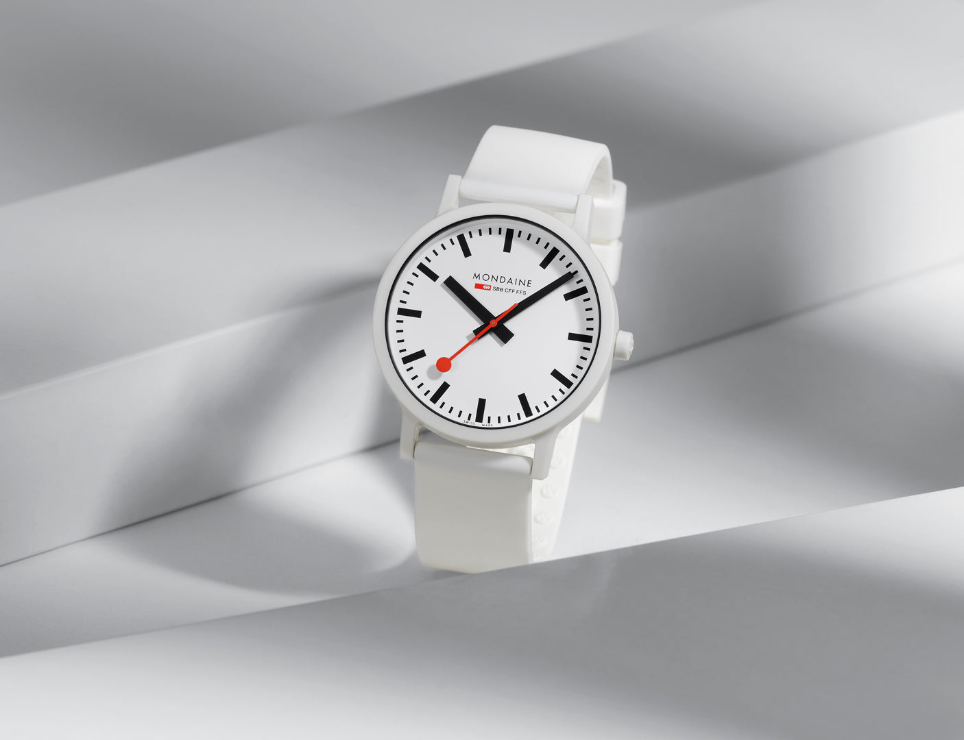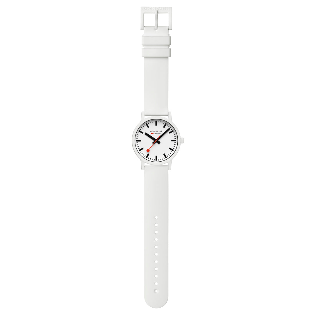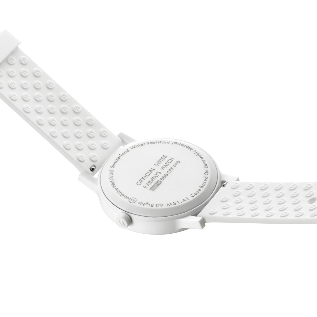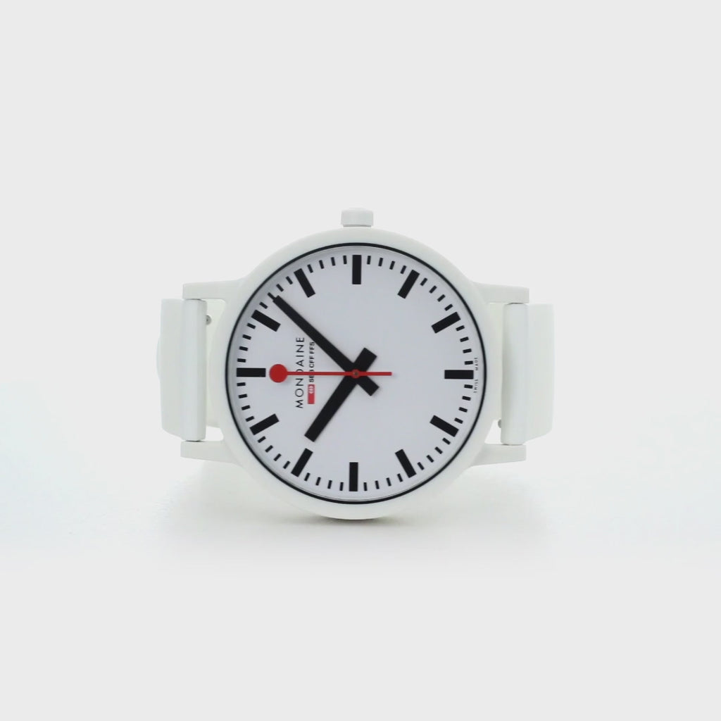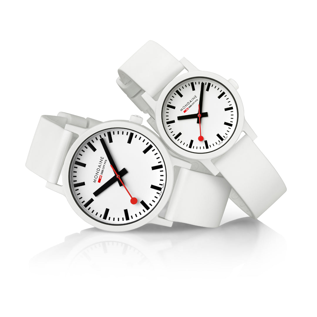 Bold. Minimal. Sustainable. This 41 mm essence watch brings a modern edge to iconic Swiss design with its crisp white dial and contrasting black inner ring. Made with a lightweight, durable case from renewable castor oil, this timepiece is as comfortable as it is conscious. Featuring the signature red seconds hand, Swiss Made quartz movement, and a quick-release strap system, it’s a perfect blend of form, function, and sustainability. A true statement for those who care about timeless style - and the planet.