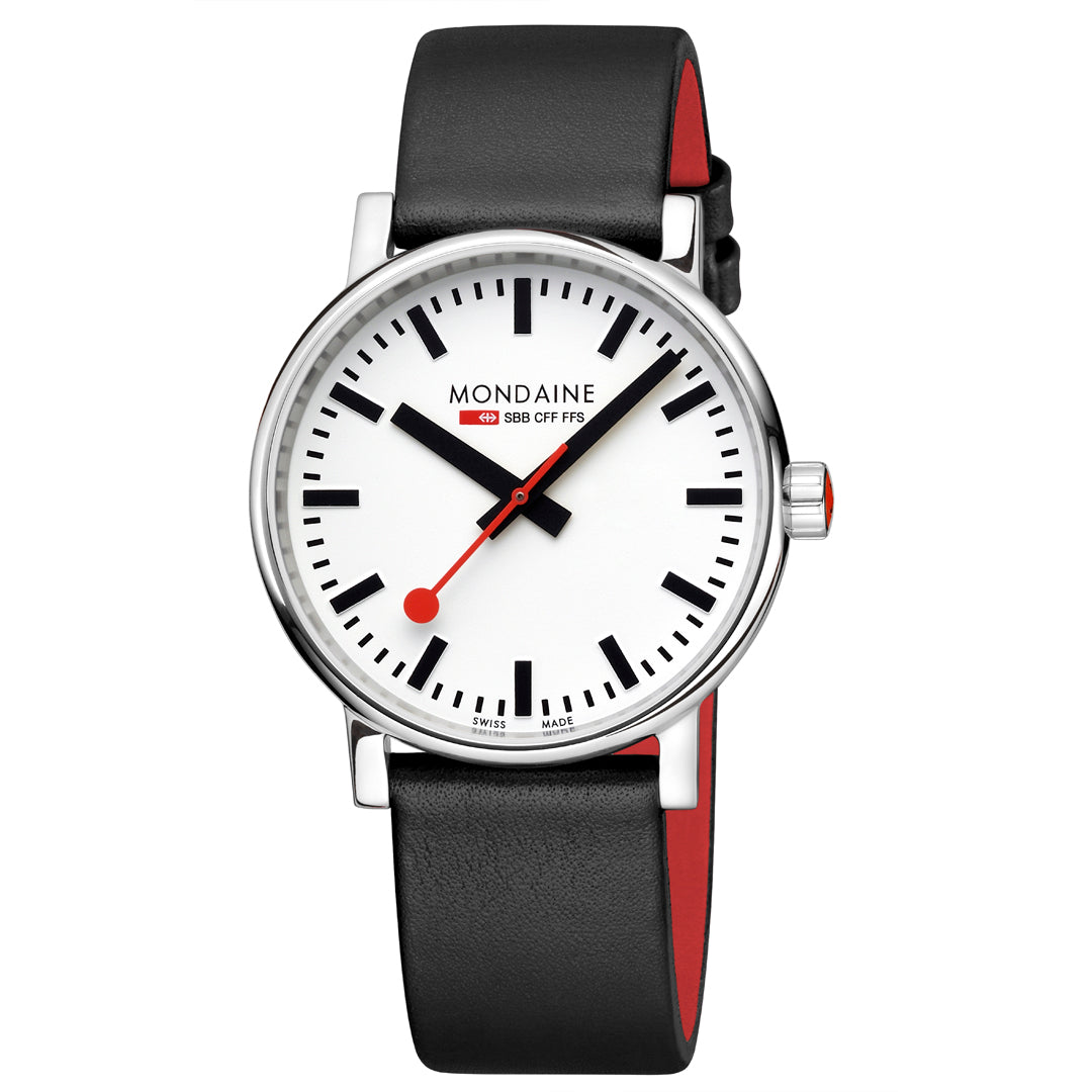 Evolutionary design: The harmoniously shaped case of the Mondaine Official Swiss Railways evo2 is made of brushed stainless steel and offers maximum comfort. The classic watch is characterized by the easy-to-read 40 mm dial, which is protected by a scratch-resistant sapphire crystal. The ergonomic red crown and elegant black vegan leather strap complete the design.