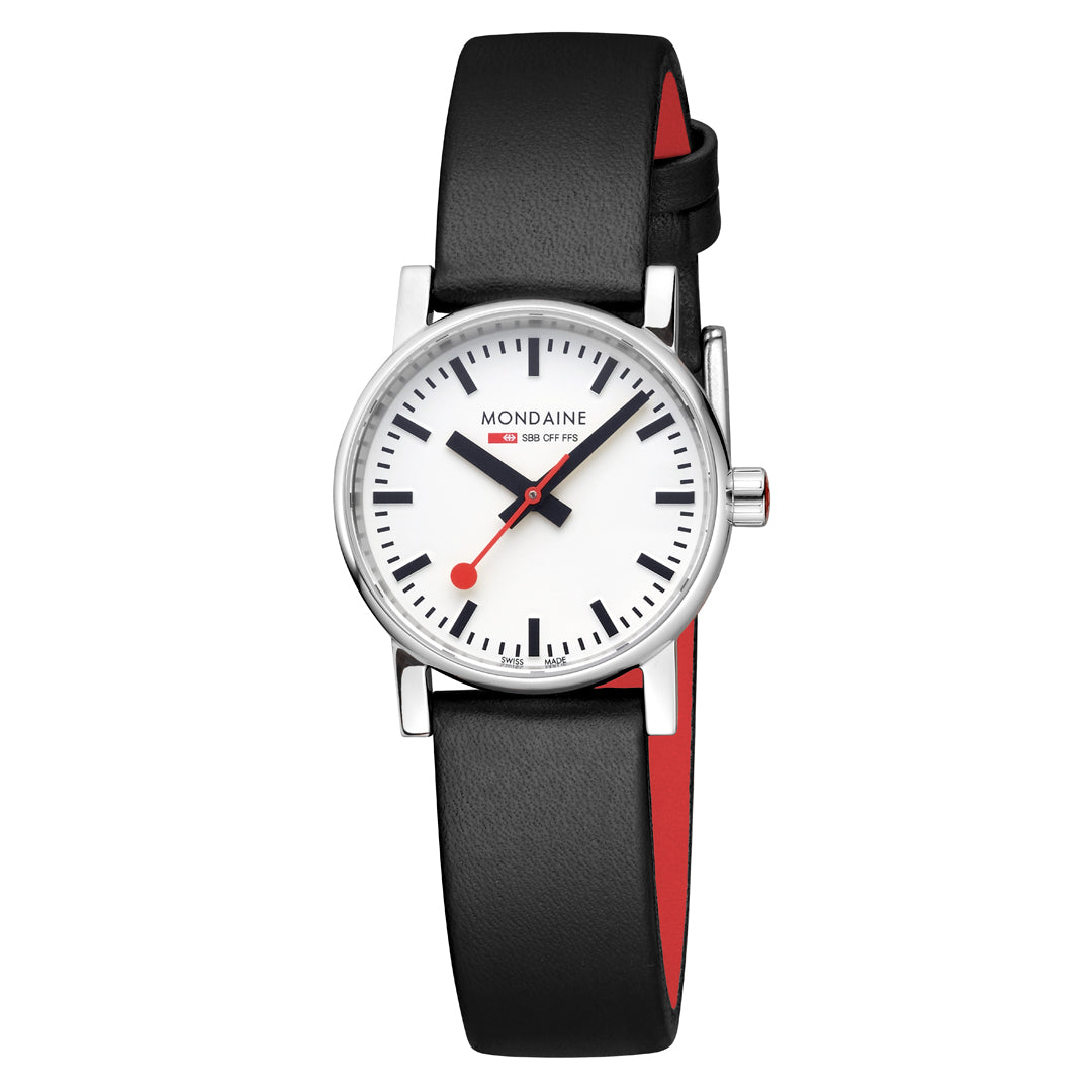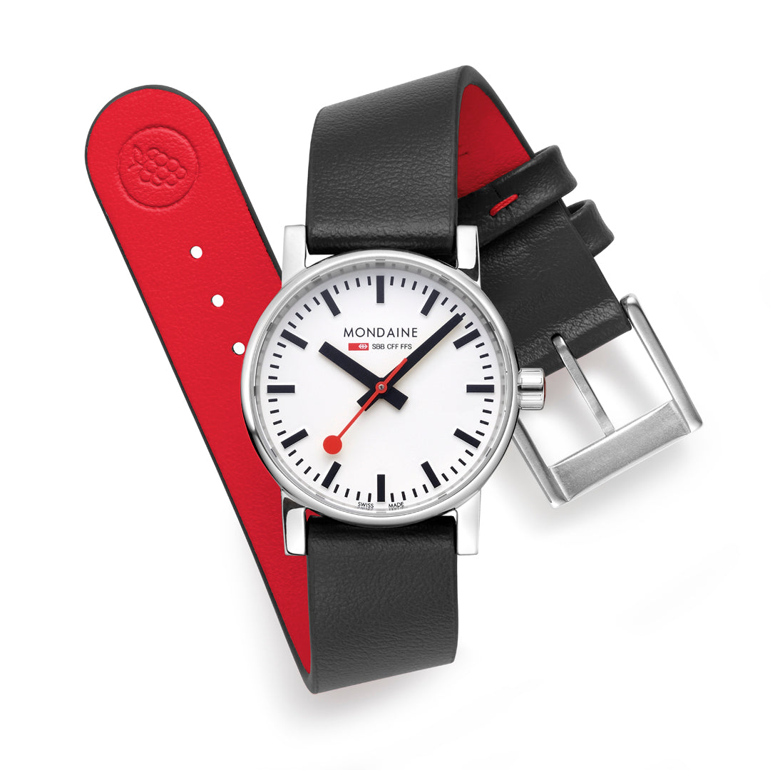 Thanks to its harmoniously designed case made out of polished stainless steel the Mondaine evo2 is very comfortable to wear. The scratchproof sapphire crystal protects the iconic dial with its prominent red second hand. The ergonomic red crown and the black vegan strap highlight Mondaine's expertise. The watch has a vegan grape leather strap in black which consists of 75% eco-friendly plant-based composite material and 25% recycled PET.