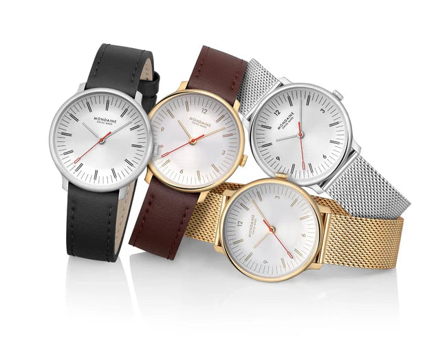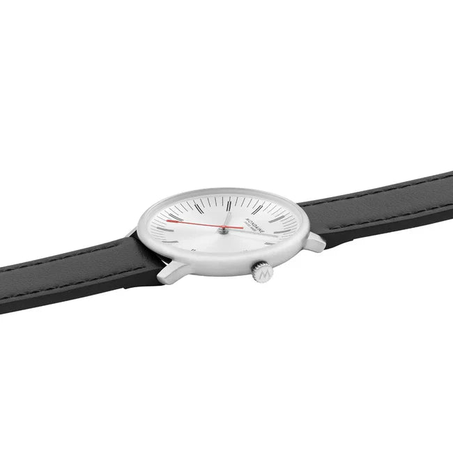 This 33 mm Doppio watch harmoniously blends vintage charm with understated minimalism. It features a concave grey and white dial with a circular brushed finish, protected by a double-domed sapphire crystal. This combination creates a striking interplay of light and depth. The design plays with the concept of duality through the double lines on the hands and indices, as well as on the tip of the seconds hand. The red colour of the seconds hand references the iconic MONDAINE Official Swiss Railways collection. The case back is engraved with the original MONDAINE logo from 1951, paying tribute to the brand's rich heritage. Powered by a Swiss quartz movement, the watch also features a date window and water resistance up to 5 ATM, adding practical functionality. The case is crafted from brushed 316L stainless steel and is made from 91% recycled material, in line with Mondaine's commitment to sustainable production. The black, vegan grape leather strap is made from organic wine production waste and offers eco-conscious style. This Swiss Made Doppio watch seamlessly combines tradition and innovation, reflecting once again the theme of duality.