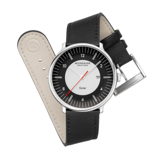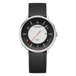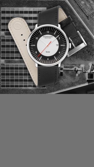 The solar-powered movements of the MONDAINE Doppio collection capture light energy via solar cells mounted beneath the dial. Solar-powered watches capture both natural and artificial light and convert it into energy, which is stored in a rechargeable battery. This means the battery doesn't need to be replaced regularly, making them a more sustainable choice. On a full charge, the watch will run for up to 8 months, even in complete darkness. For optimal performance, regular charging in direct sunlight is recommended, as this allows for the fastest recharge.